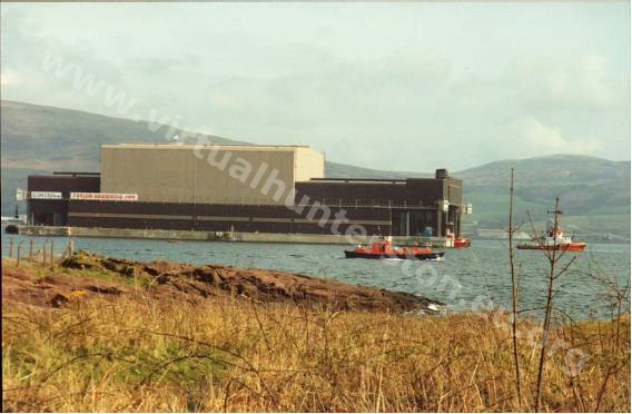 In 1992 the Dry Dock was complete and site was flooded. Shortly after this the sea wall was broken away and the structure was floated out into the River Clyde where it was towed to its new home at RNAD Coulport at Loch Long.